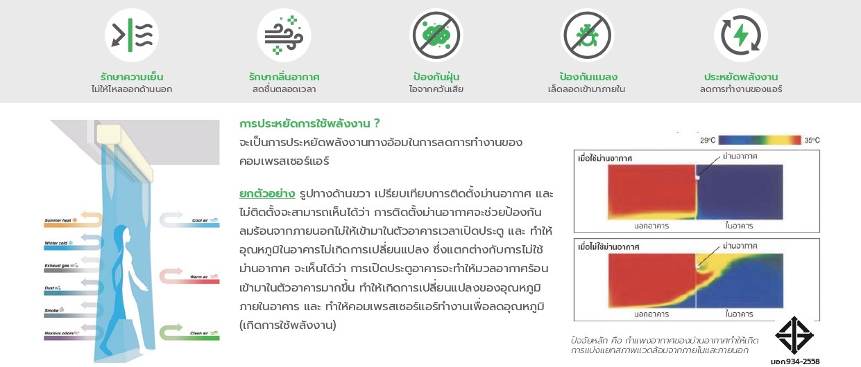 Air Curtain (ม่านอากาศ) คือ กำแพงอากาศที่มองไม่เห็นด้วยตาเปล่า โดยตัวเครื่องจะสร้างกำแพงอากาศที่มองไม่เห็นเหนือประตู ทำให้ผู้คนสามารถเดินผ่านข้าออกได้จากพัดลมภายในตัวเครื่องที่นลมลงมในแนวดิ่ง เพื่อแบ่งแยกสภาพแวดล้อมภายใน ภายนอกได้อย่างมีประสิทธิภาพ ม่านอากาศจะทำหน้ที่ช่องกันอากาศภายในหลออกภายนอกและภายนอกไหลเข้าภายในเพื่อช่วยประหยัดพลังงาน ม่านอากาศยังช่วยป้องกันผุน ไอเสีย กลิ่นไม่พึ่งประสงค์ แมลง เข้ามาภายในอีกด้วย