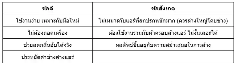 ใช้ได้ในระดับหนึ่ง แต่ถ้ามีคราบหนักหรืออุดตันมาก แนะนำให้ช่างล้างแอร์แบบถอดล้างจะเห็นผลดีกว่า